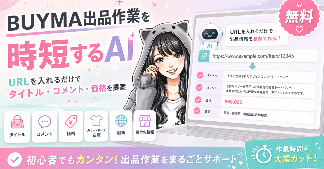 BUYMA出品作業を時短するAIを作ってみました 2026 4/26 利益計算 note(ノート) 出品サポートAIを作ってみた|まいち丨なろう系チート主婦 BUYMA初心者さん用。 「商品タイトルどうすればいいの?」 「商品コメントで毎回時間かかる…」 「英語(伊語/仏語)の翻訳がしんどい😥」 そのレベルの悩みを一気に解決す... ↑共有リンク、使い方はこちらの記事をご覧ください。 利益計算 よかったらシェアしてね! URLをコピーしました! URLをコピーしました! こんな商品が売れている 高値売り事例 この記事を書いた人 Mai Import Buyer Academy代表 関連記事 こんな商品が売れている 高値売り事例 2026年3月19日 VATオフの細かい計算方法と利益率の出し方 2026年3月16日